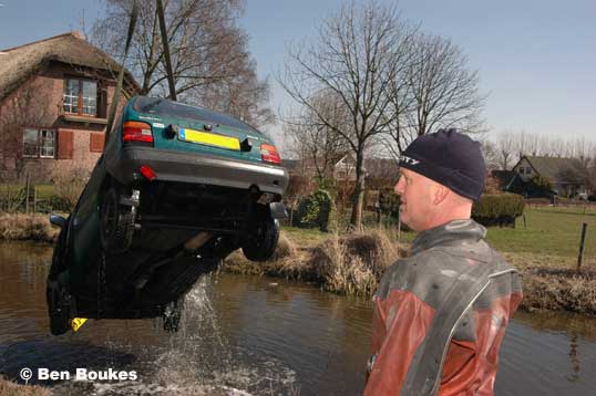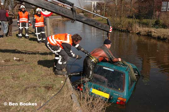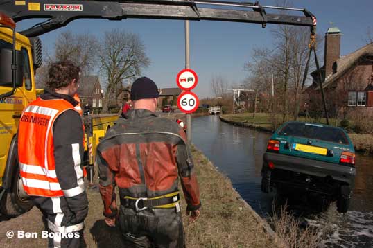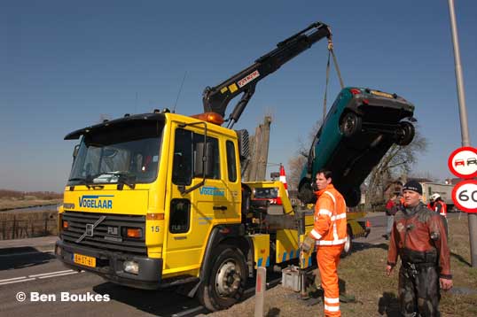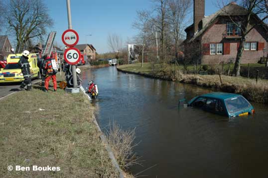 Een auto te water op de Katwijkerlaan in Pijnacker.