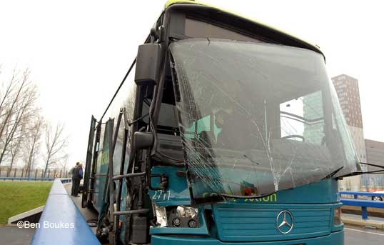 Een bus tegen de vangrail op de Afrikaweg in Zoetermeer.
